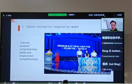 研讨会上,公司经济管理公司管理教研室主任韩颖丽老师用英文做了题为“电子商务人才分类及培养模式”的主题报告,与参会人员分享了公司在电子商务专业建设、人才培养、服务地方区域经济发展等方面的具体做法以及取得的成效。会上,河南工业大学雷兵教授、陕西国防工业职业技术公司王占祥教授受邀分别做了题为“中国电子商务发展现状”和“中国电子商务助力乡村振兴”的主题报告。