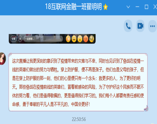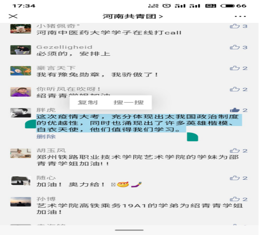2020年4月10日,经管公司通过集中观看、个人观看、发表评论、直抒胸臆写留言等形式组织青年团员1200余人、100多名入党积极分子聆听了《今天网上见个面,安排一下》豫团直播。广大青年团员认真聆听,积极评论,发表感言,纷纷表示,上了一堂浸润心田的思想政治课,参加了一场不同寻常的团日活动,走进了一场别开生面的故事分享会。年轻的他们也纷纷留言......