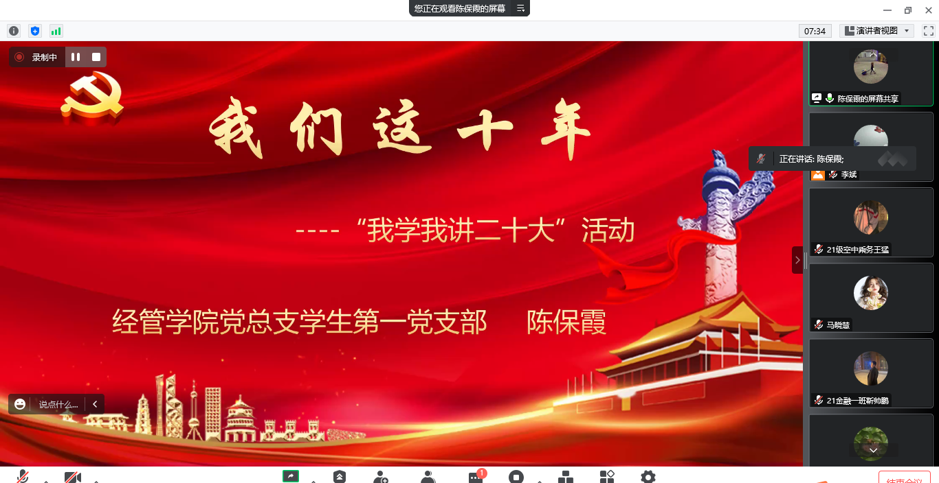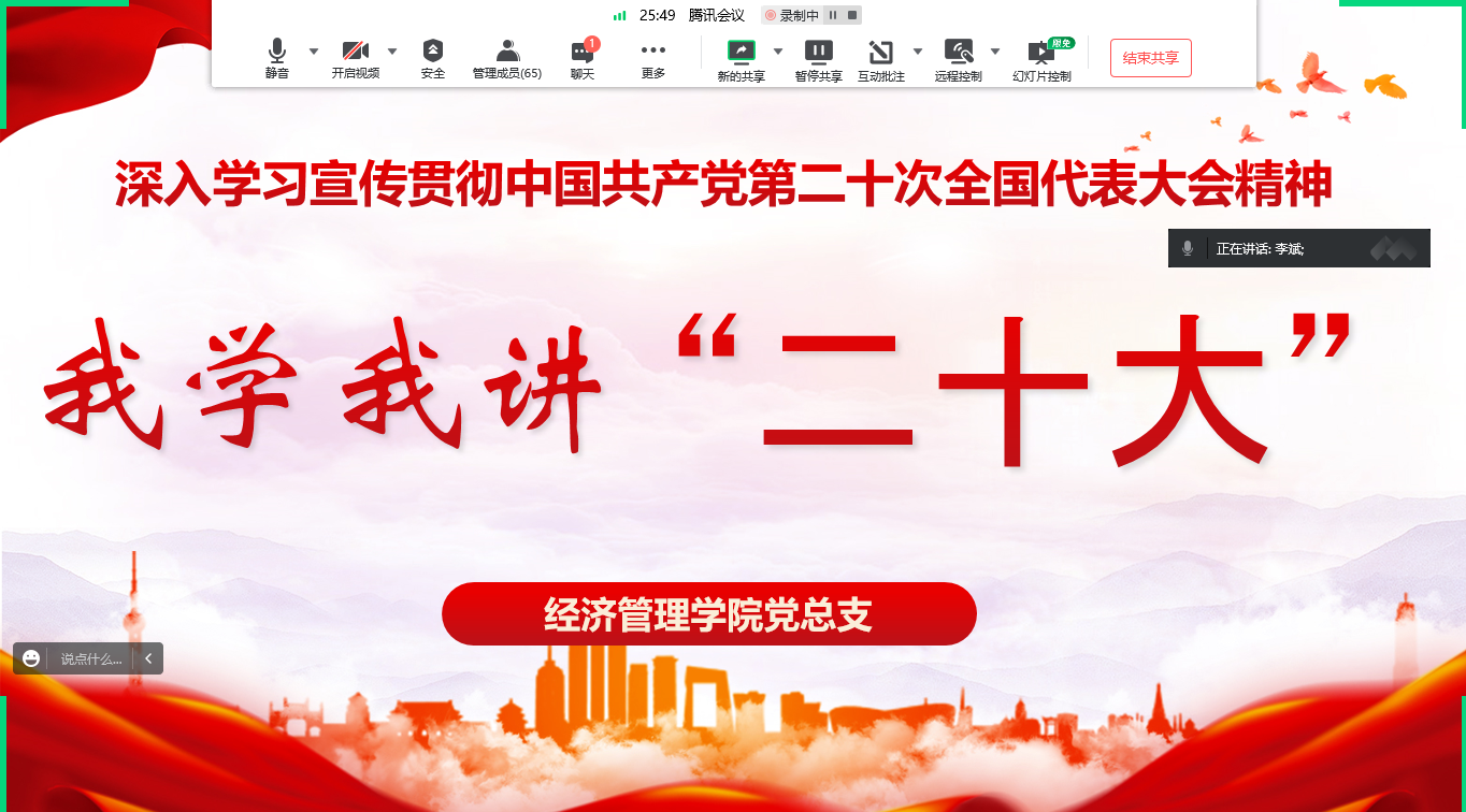 11月2日下午,党总支通过腾讯会议开启了线上“我学我讲二十大”集中讲学活动。开启第一讲的四名党员为了讲好课,认真准备,原原本本学习党的二十大报告和大会通过的《中国共产党章程(修正案)》,研读评论员文章,摘记知识要点,撰写授课讲义。在谈体会时,党员同志纷纷表示,这次活动引导广大党员主动站前台、唱主角,变“要我学”为“我要学”,从“听你讲”到“我来讲”,活动形式新颖了,学习效果也更好了。后续担负讲授任务的同志,也在积极认真准备,聚焦重点内容开展自学,努力在“学懂”上下功夫,“讲”出来。