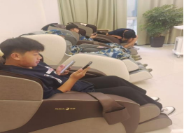 随后,一行人来到了心理器材室。这个充满科技与温馨的空间内,摆放着各式各样的心理器材,旨在帮助员工通过各种方式释放压力、放松心情。特别值得一提的是,员工们还有机会亲身体验了按摩椅带来的舒适与放松。在紧张的学习之余,这些按摩椅成为了员工们缓解疲劳、减轻焦虑的小小“避风港”。