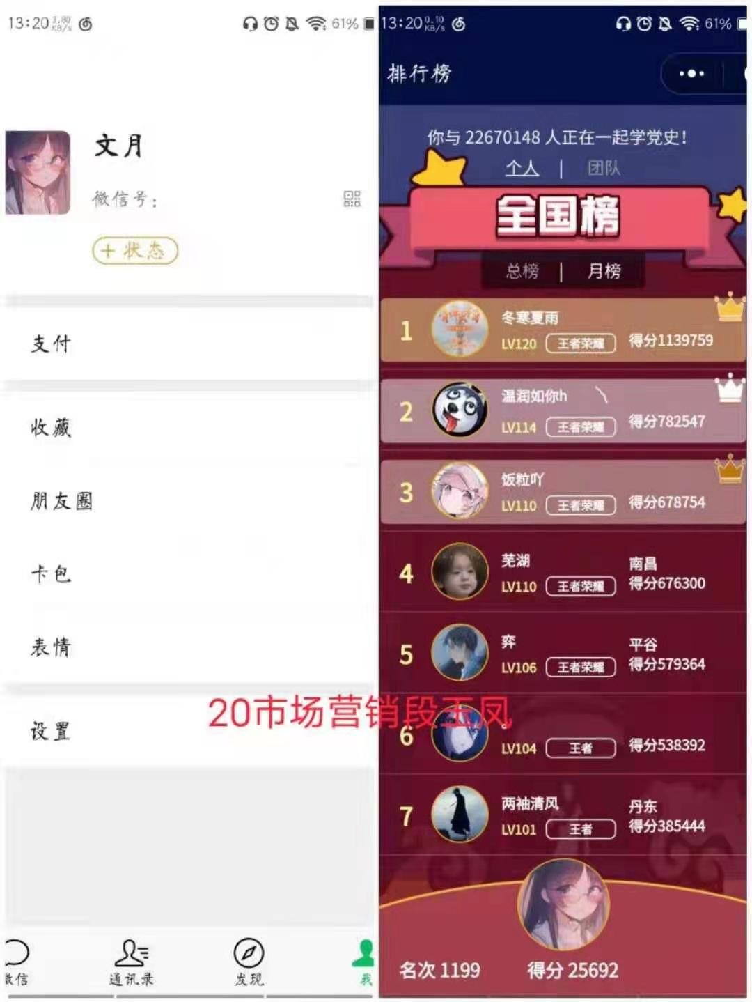 为深入推进党史学习教育,加深师生党员对党史的了解,营造更加浓厚的学习氛围,经管公司员工第一、第二党支部丰富学习形式,创新“自选动作”,举行了线上党史知识竞赛。活动通过微信小程序“一起学党史"组织师生一起挑战答题。同学们积极踊跃参加,学习热情高涨,最终,2020级市场营销班段玉凤夺得头筹,共计25692分,本月全国排名榜1199名。