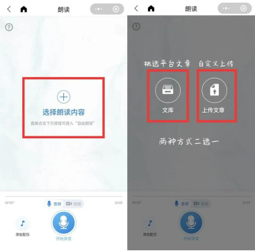 ③点击+号,进入“优谷文库”,请围绕“悦读·新知·致敬”主题选择文库中合适的素材进行朗读,要求内容健康积极、展示青年的精神面貌担当,也可以自己上传素材朗读。