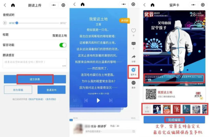 ⑥选手提交作品参赛后,系统支持生成精美的留声卡,如图示,点击试听页面右侧"留声卡",图片背景和文字均支持自定义,选择确定后完成编辑保存至手机,就可以分享传播。老师们还可以积极拉票,争取最佳人气奖哦!