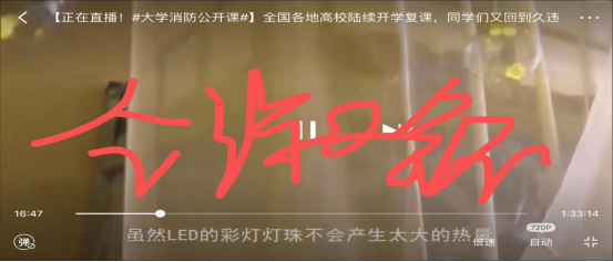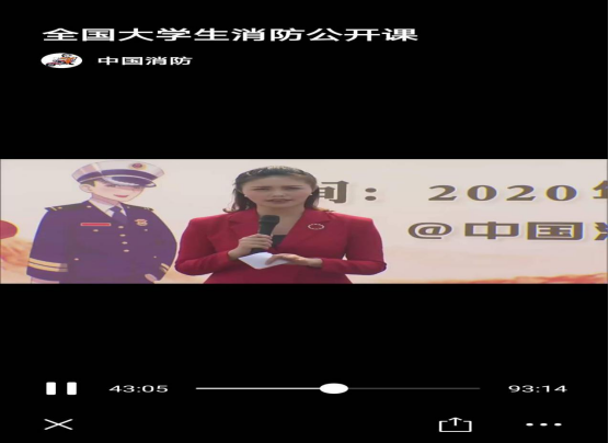 为做好开学复课消防安全指导服务工作,普及消防常识和逃生技能,提高公司消防安全宣传教育工作水平和老员工群体的消防安全素质,根据河南省消防救援总队通知要求,结合实际,按照公司有关要求公司通过网络回看直播方式,开展观看“大学消防公开课”直播活动,公司全院师生1800余人参与了消防公开课的观看,观看率达90%以上。部分截图如下: