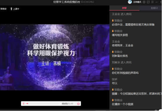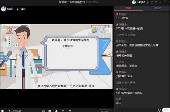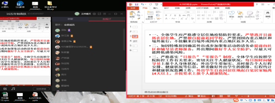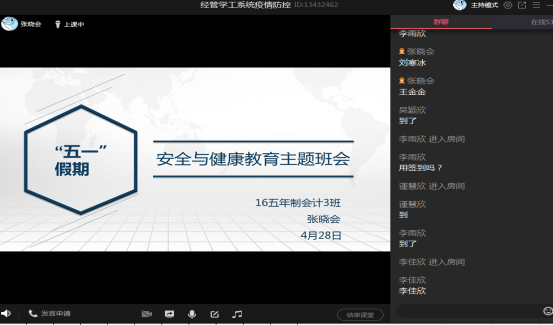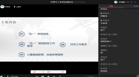 为了高质量开好本次班会,全体辅导员精心备课,做足准备。班会通过腾讯课堂、防控QQ群等途径召开,主要传达及强调了以下几方面内容:一是传达公司关于“五一”假期假期的相关要求,尽量减少外出,在居住地城市范围内活动,并严格遵守居住地疫情防控相关要求,严禁离开目前所在居住地。二是强调现在疫情防控虽然持续向好,但绝不能有麻痹大意思想,仍然要加强个人防护,如需外出,一定要佩戴口罩,勤洗手、勤通风;不参加聚集性活动,不置身人员密集密闭空间。三是集中回答同学们目前比较关切的问题。公司正在科学研判开学时间,如有确切消息,会第一时间通知。没有收到辅导员老师关于开学的通知之前,无论任何理由,严禁提前返校。同时,要检查做好每天的信息收集、体温上报、二维码信息填报等工作,以上是科学研判开学时间的重要依据,一定要准确、按时填报。如本人或家人出现体温异常或者身体不适,一定要第一时间告知辅导员老师,早发现、早处理。四是集体观看视频,以趣味性的方式结合实际进行讲解,假期在家,接触电脑或手机的时间增多,一定要保护好视力,调节好情绪,适当锻炼身体,多读书,培养兴趣爱好。