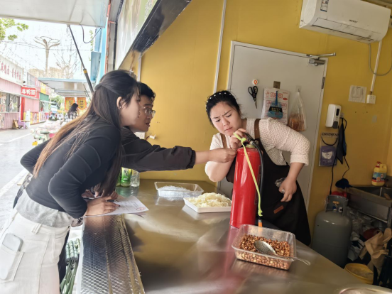 理论学习结束后,30余名师生党员、积极分子组成“安全先锋队”,由社区网格员、师生党员联合开展安全生产大检查。检查覆盖璀璨天街商户消防设施、电气线路、应急通道等关键领域,现场排查隐患3处,建立“一户一档”整改台账,并通过“回头看”机制确保闭环管理。“我们创新采用‘专业指导+网格排查’模式,既发挥高校师生的技术优势,又依托社区网格化管理经验,提升检查精准度。”教师党员介绍。活动同步发放《安全生产手册》200余份,通过“案例讲解+实操演示”普及安全知识,强化商户主体责任意识,助力一刻钟生活圈“社区文化圈”建设。
